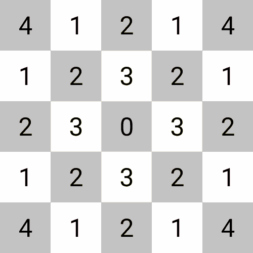 The digits represent the minimum number of knight-moves needed to reach the respective cells, starting from the center.