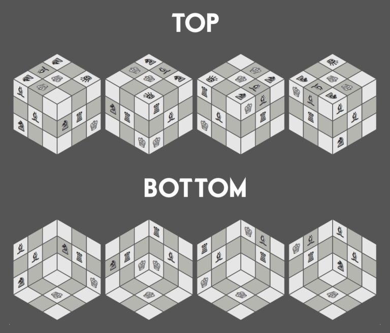Last week we found out that Puzzle Pranks Co. have invented a new type of puzzle – Rubik’s Chess. The goal is simple – you get a scrambled cube with various chess pieces on its sides, and you must unscramble it so that on each side there is one mated King, assuming the kings