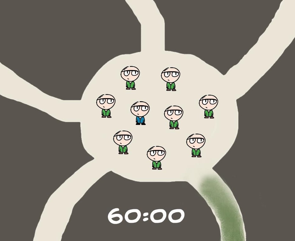 You and eight of your team members are trying to escape the Temple of Doom. You are running through a tunnel away from a deadly smoke and end up in a large hall. There are four paths ahead, and exactly one of them leads to the exit. It takes 20 minutes to explore any of the four paths one way, and your group has only 60 minutes until the deadly smoke suffocates you. The problem is that two of your friends are known to be delirious and it is possible that they do not tell the truth, but nobody knows which ones they are. How should you split the group and explore the tunnels, so that you have enough time to figure out which is the correct path and escape the temple?