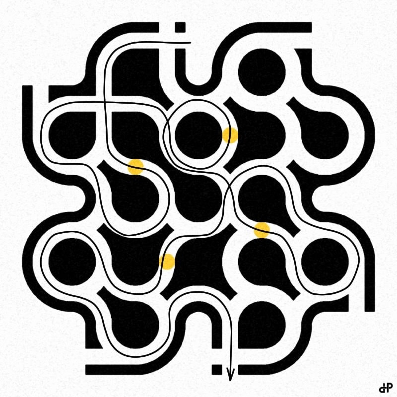 Enter the maze, pass through all yellow circles, then leave the maze. Go only the flow, not shard turns.