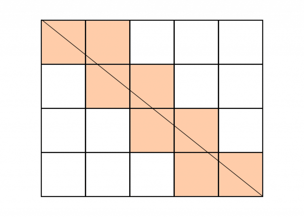 Notice that the number of small squares the main diagonal passes through is equal to the number of horizontal and vertical lines it intersects. Indeed, every time the diagonal goes through the interior of one square to the interior of another, it must intersect one of these lines.