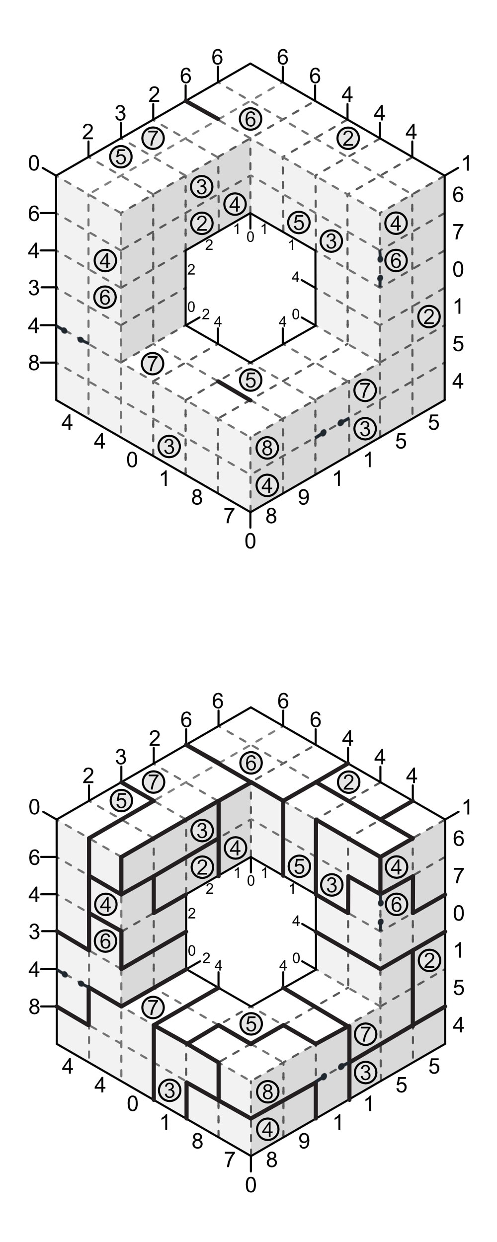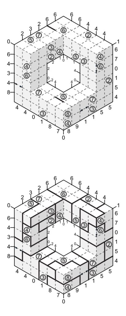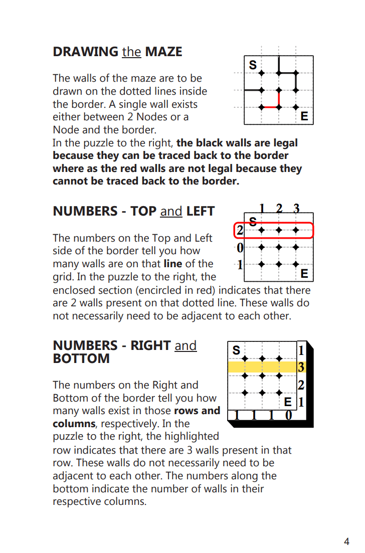- BOOK 4: Sunome Blocks – instead of a creating a maze, the player must break the grid into shapes with predetermined sizes, similarly to Shikaku