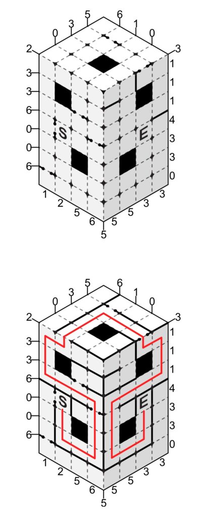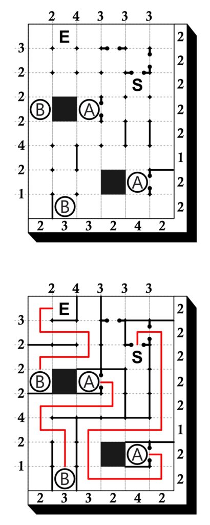 Sunome puzzles come in the form of a grid with numbers on the sides, and a Start (S) and End (E) cells inside. The goal is to design a “proper” maze with the given Start and End cells, such that the amount of vertical and horizontal walls in each row and column is predetermined by the numbers around the grid. The meaning of “proper” involves a lot of technical requirements, such as existence of a unique path from Start to End, lack of closed off regions, etc.
