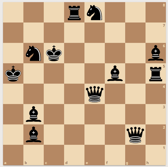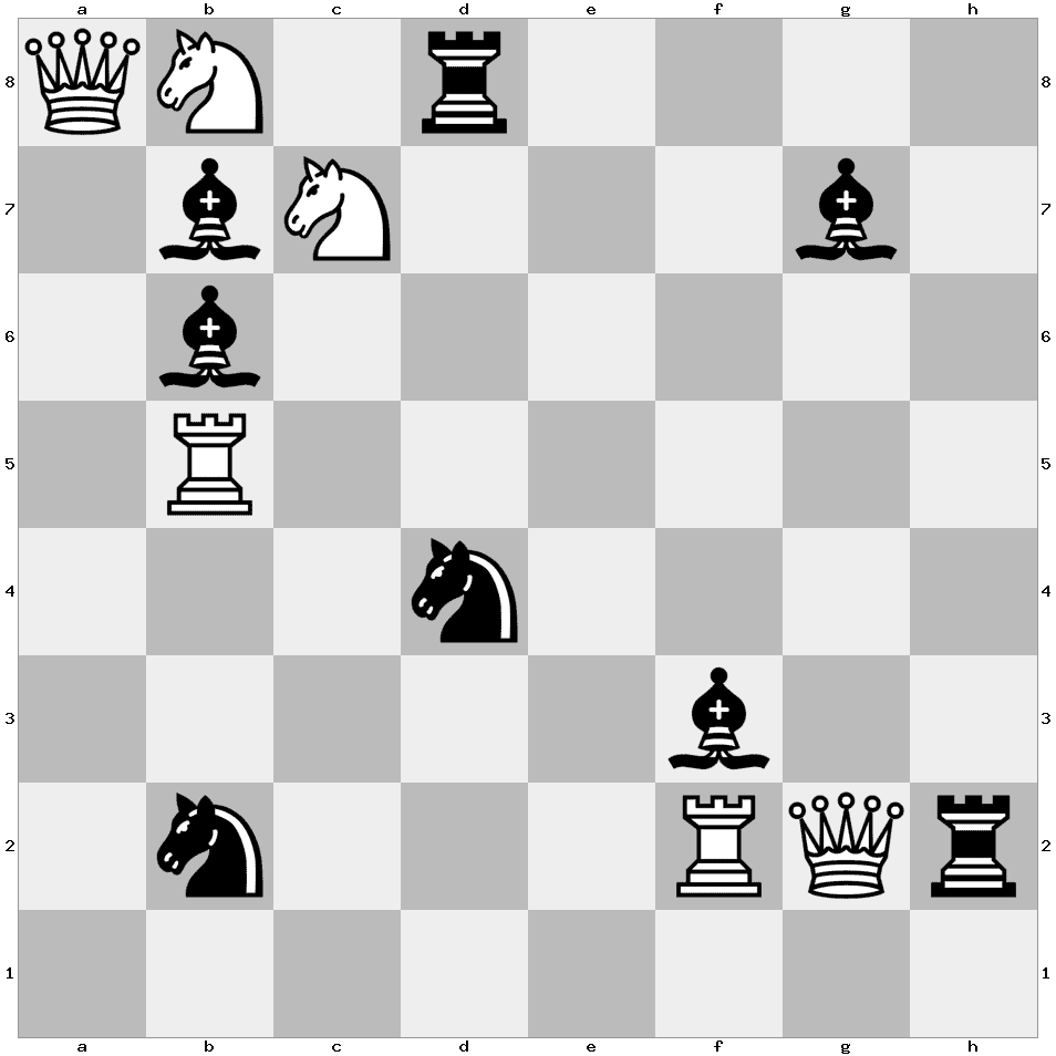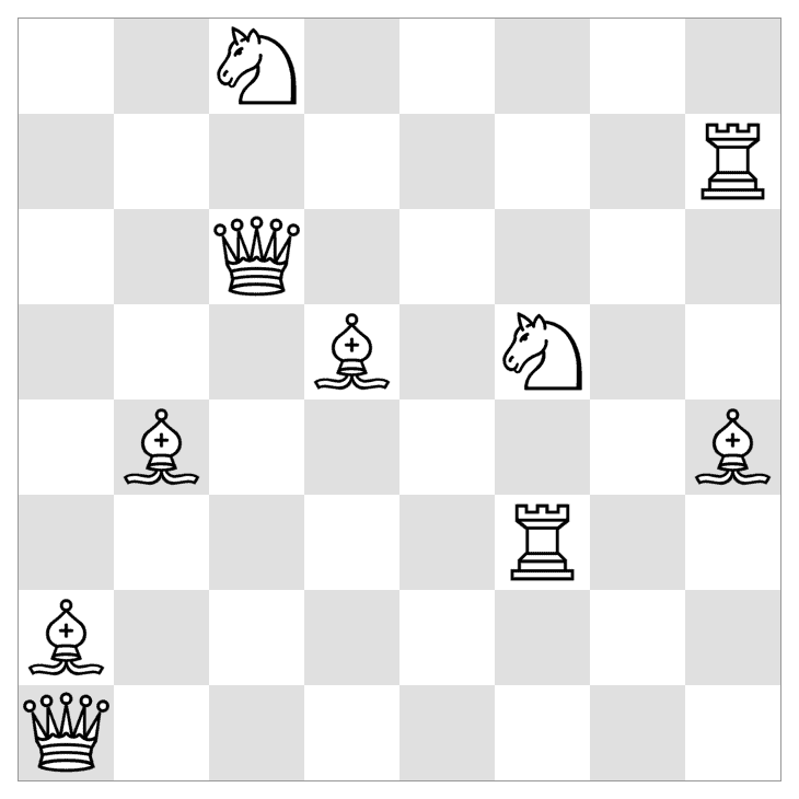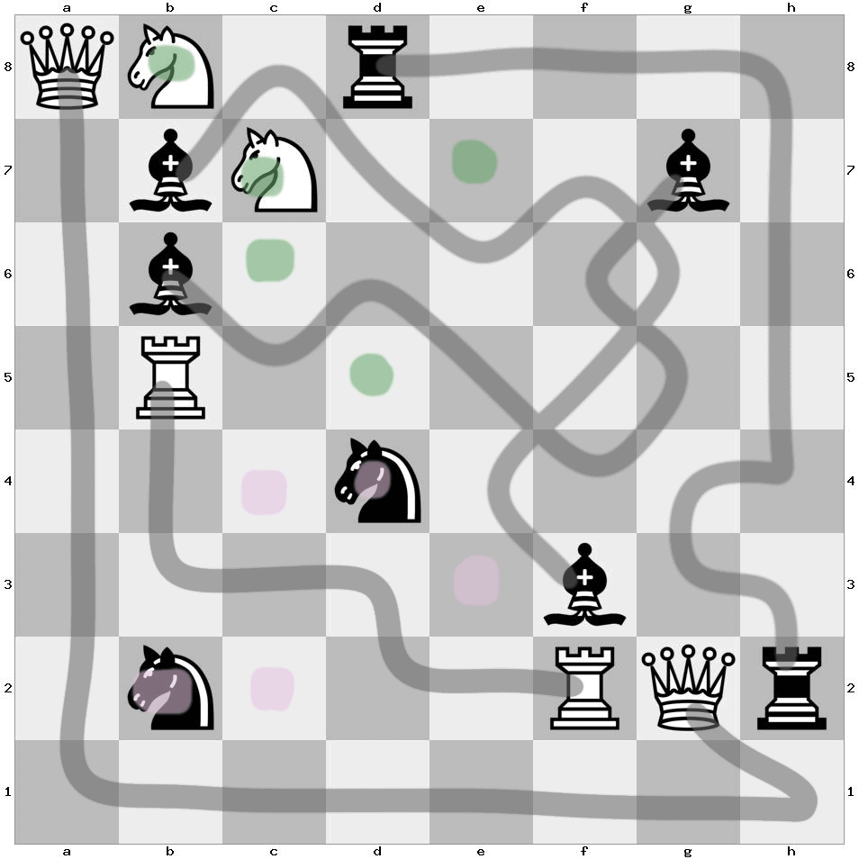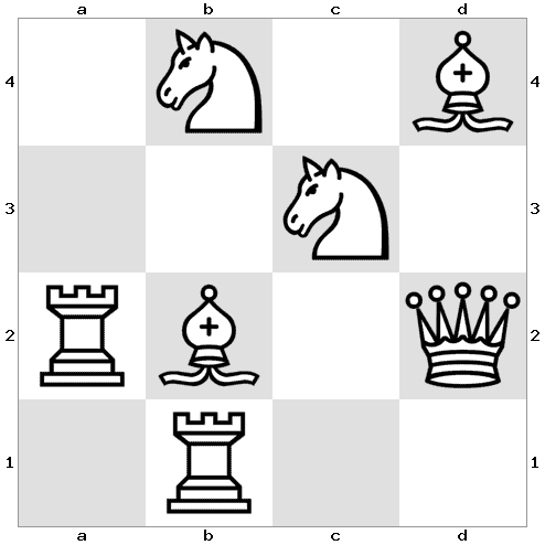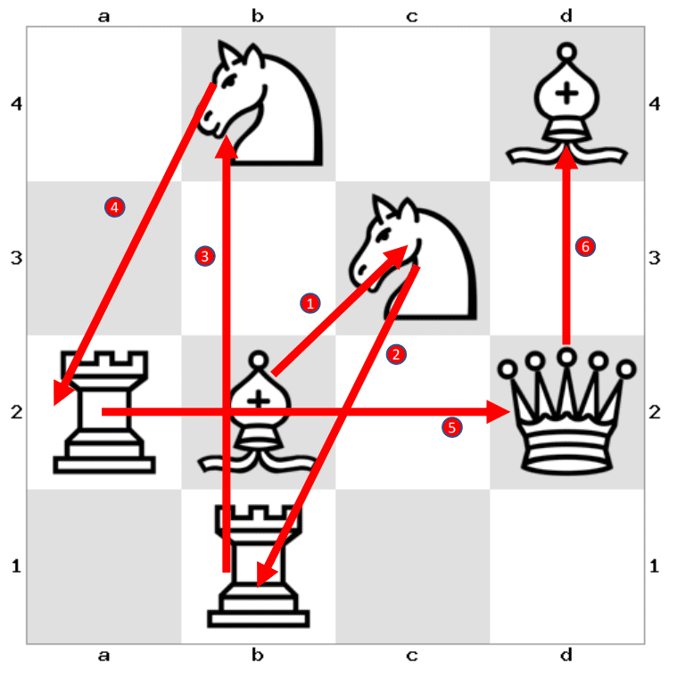 Note: For example, we can move the Queen on d2 to the Bishop on b2, the Knight on c3, or the Bishop on d4. If we move the Queen to d4 and remove it from the board, then we must move the Bishop on d4. The only available cell is c3, where a Knight is positioned. We must remove the bishop and move the Knight on c3 either to the Rook on b1 or the Rook on a2…