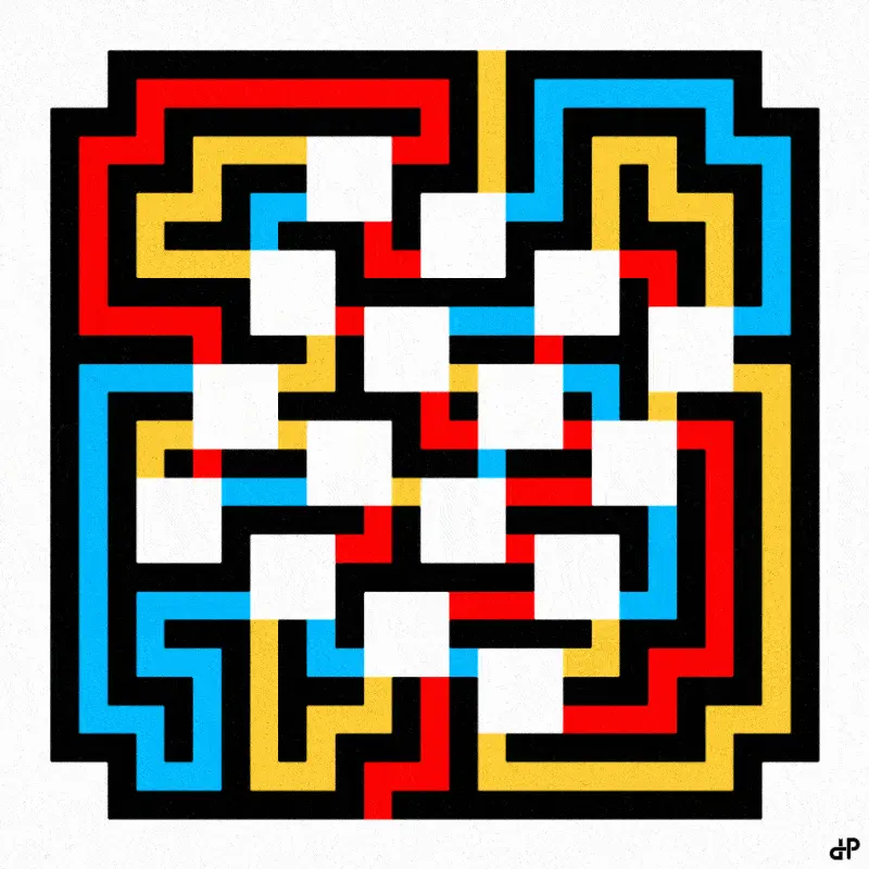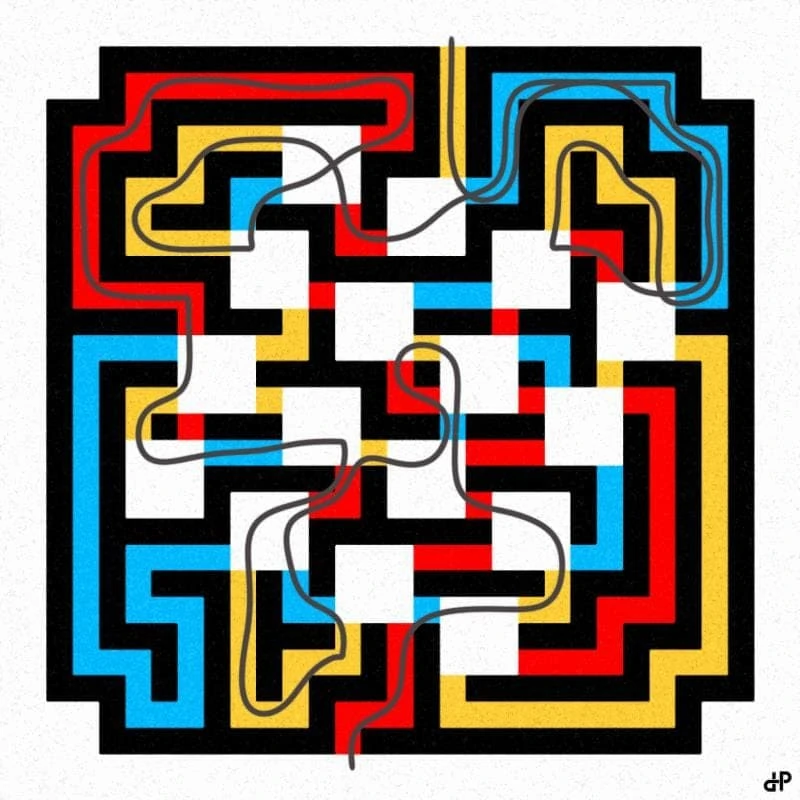 Enter by the bottom red path and exit from the top of the maze. You may retrace your path, but you may not make a U-turn on a pathway. You must follow the paths in the order red, blue, yellow, and then red, blue, yellow again, changing color at the white squares.