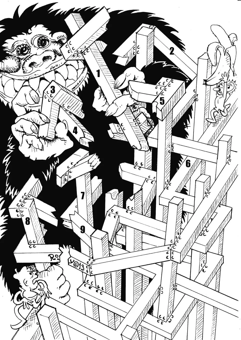 Detective Roy Omoshi (upper right) is chasing a dangerous criminal (lower left) through a destroyed maze. King Kong is trying to help Roy by putting together all the pieces of the maze so that the detective can safely traverse it. Analyze the picture and find the sequence of pieces Roy Omoshi will pass through before he catches the criminal. Some pieces (#1, #7, #8) consist of multiple horizontal segments, so it is possible that the detective visits them multiple times.