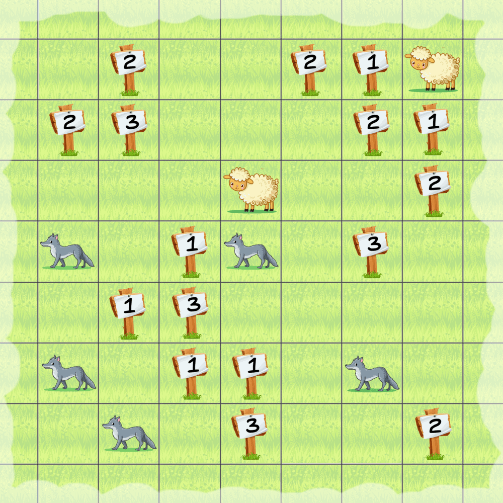 A shepherd takes his two sheep every day to a 7×7 lawn, so that they can eat the fresh grass there. However, there are five wolves on the lawn which are preying on the poor sheep. The shepherd decided to build a closed, non-intersecting fence around the sheep, so that all wolves end up on the outside. He planned the shape of the fence carefully and installed several signs showing the number of fence pieces around the corresponding cells. Can you figure out the shape of the fence the shepherd is going to build?