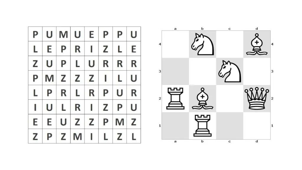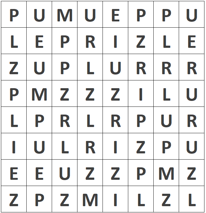 Start from a square with a P on the chessboard, and keep jumping via knight’s move, consequently landing on squares with the letters U-Z-Z-L-E-P-R-I-M-E.