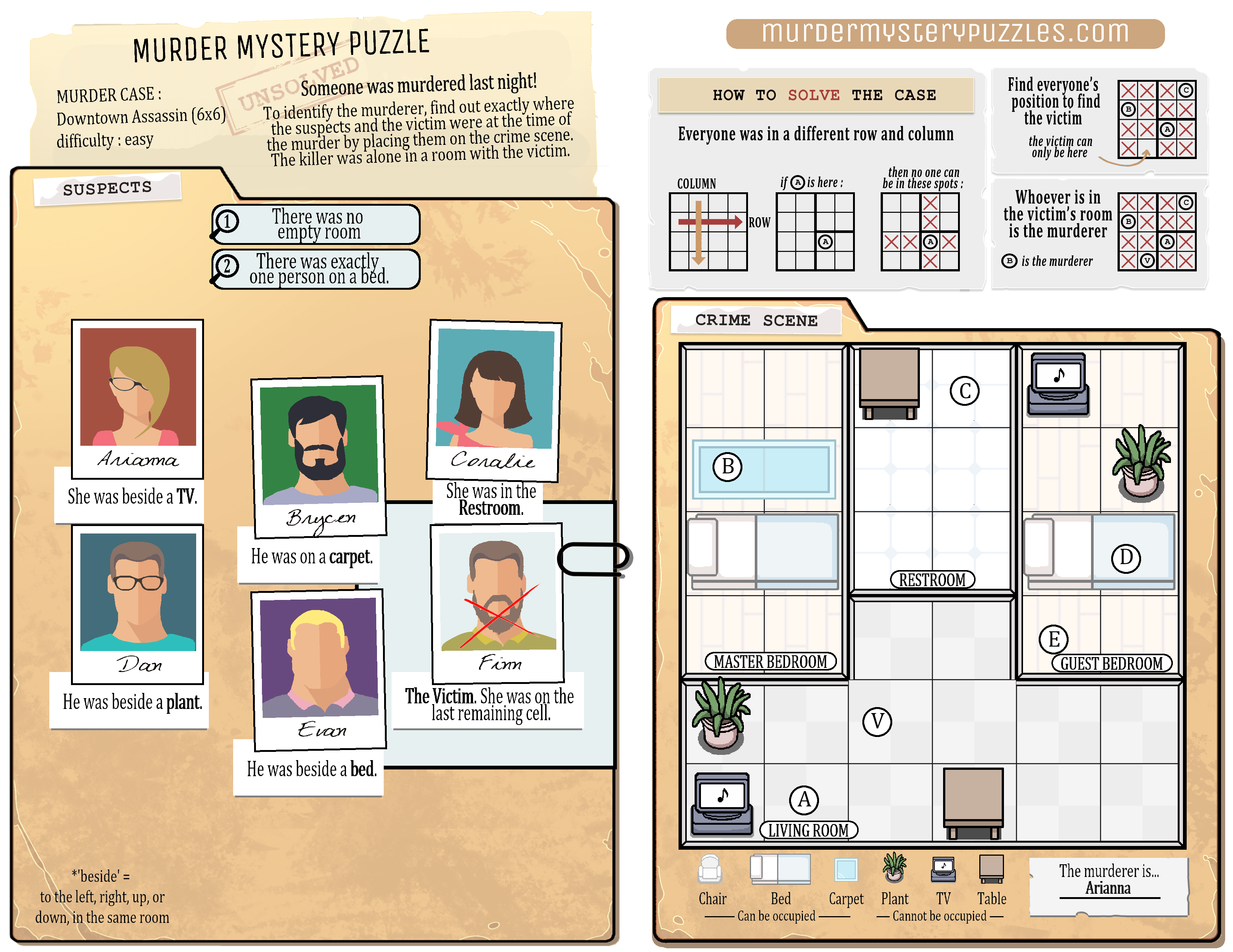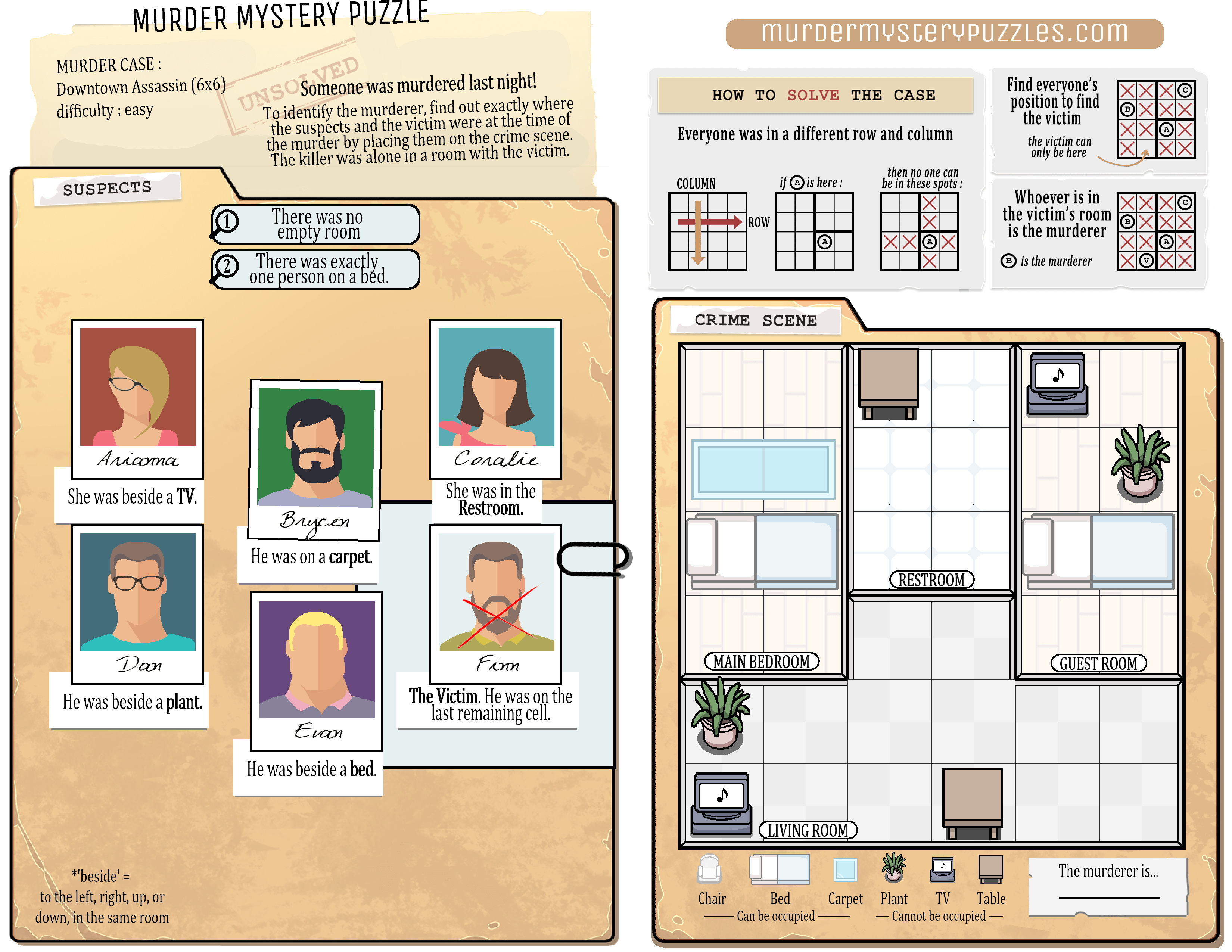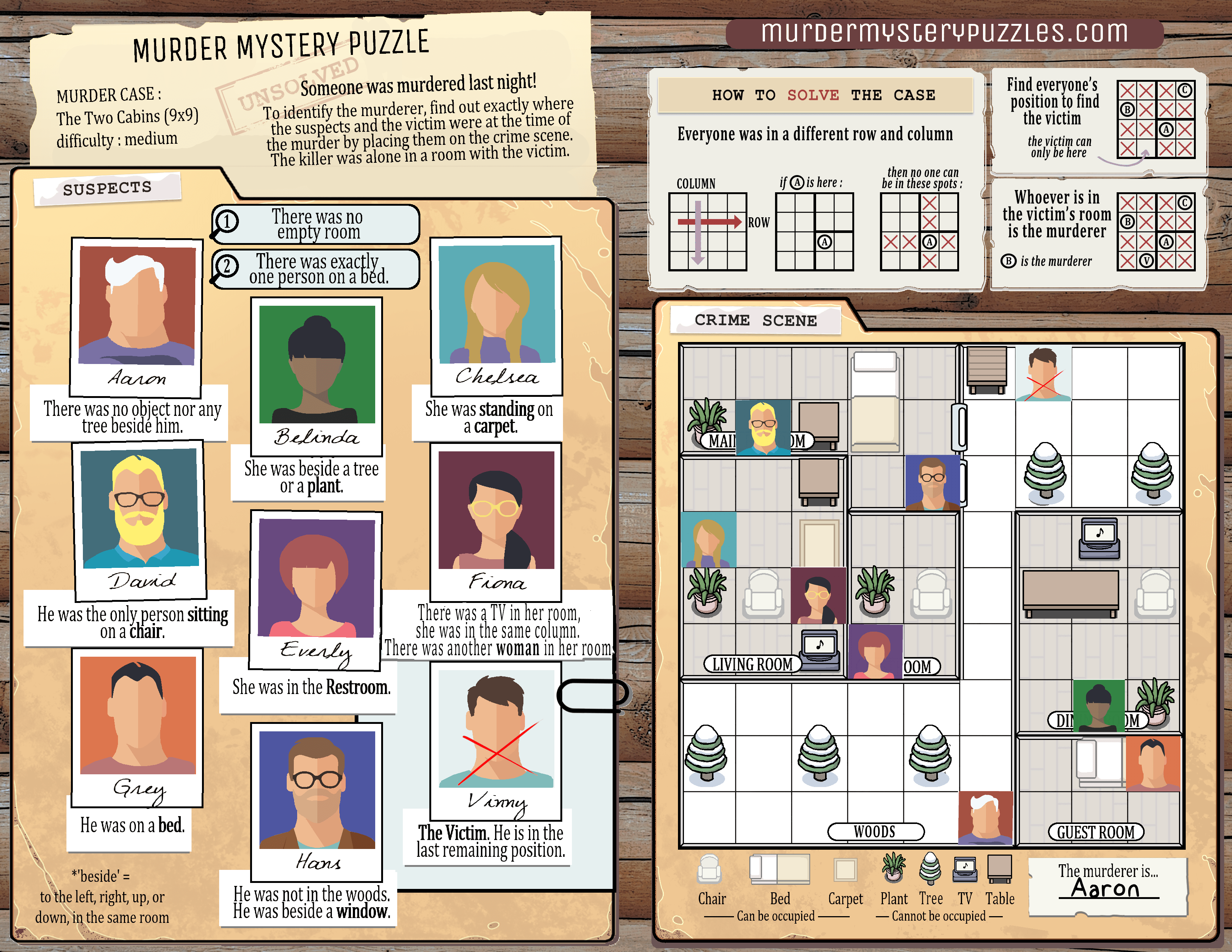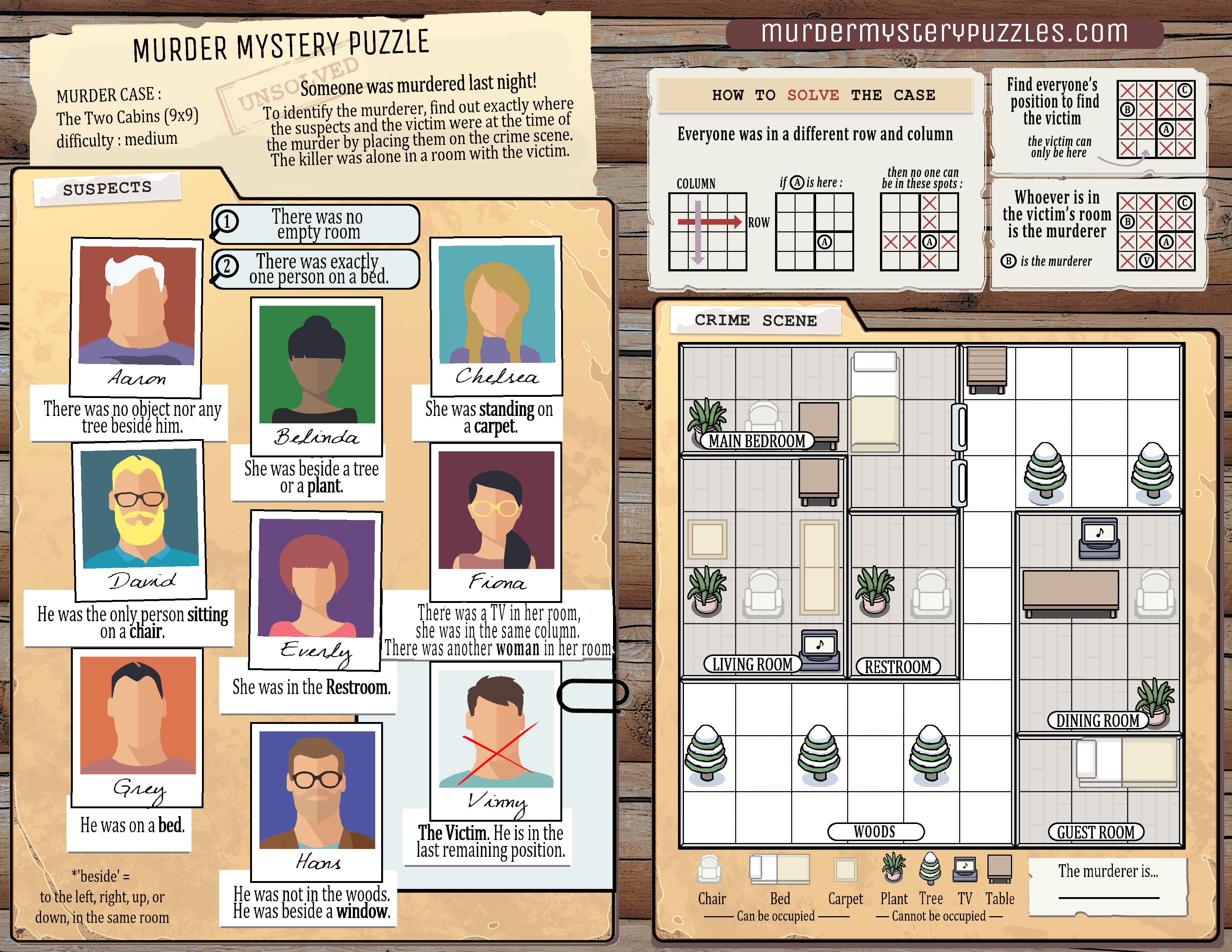 In the three murder cases below, you can read the testimonies of all suspects. For each case, find who the killer is, knowing that no 2 people are in the same row or column, and that the killer was alone in a room with the victim.