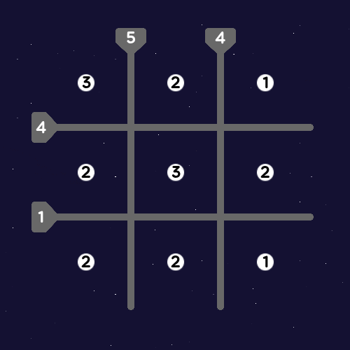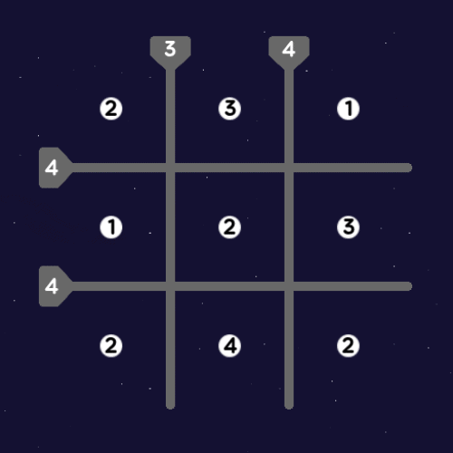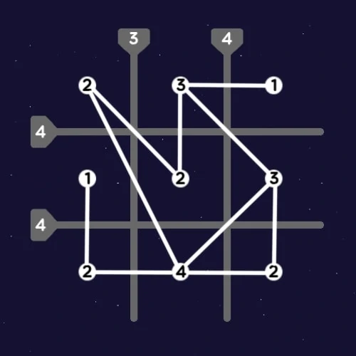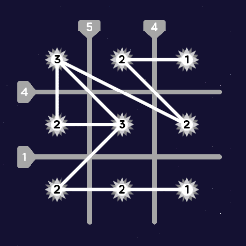 Connect the stars with lines, so that the number inside each star corresponds to the number of lines connected to it, and the number in each barrier corresponds to the number of lines intersecting it.
