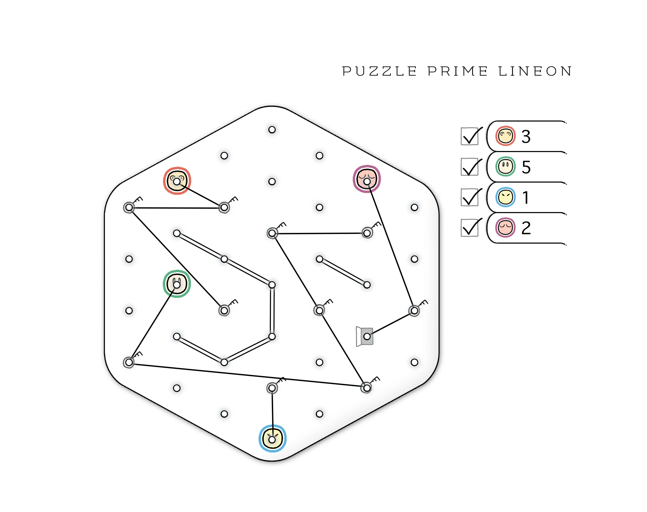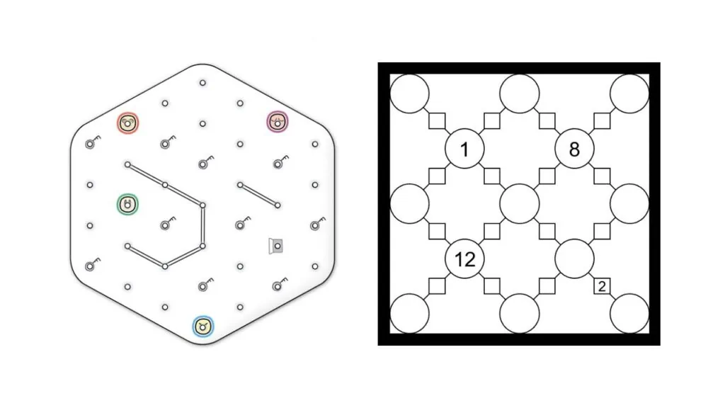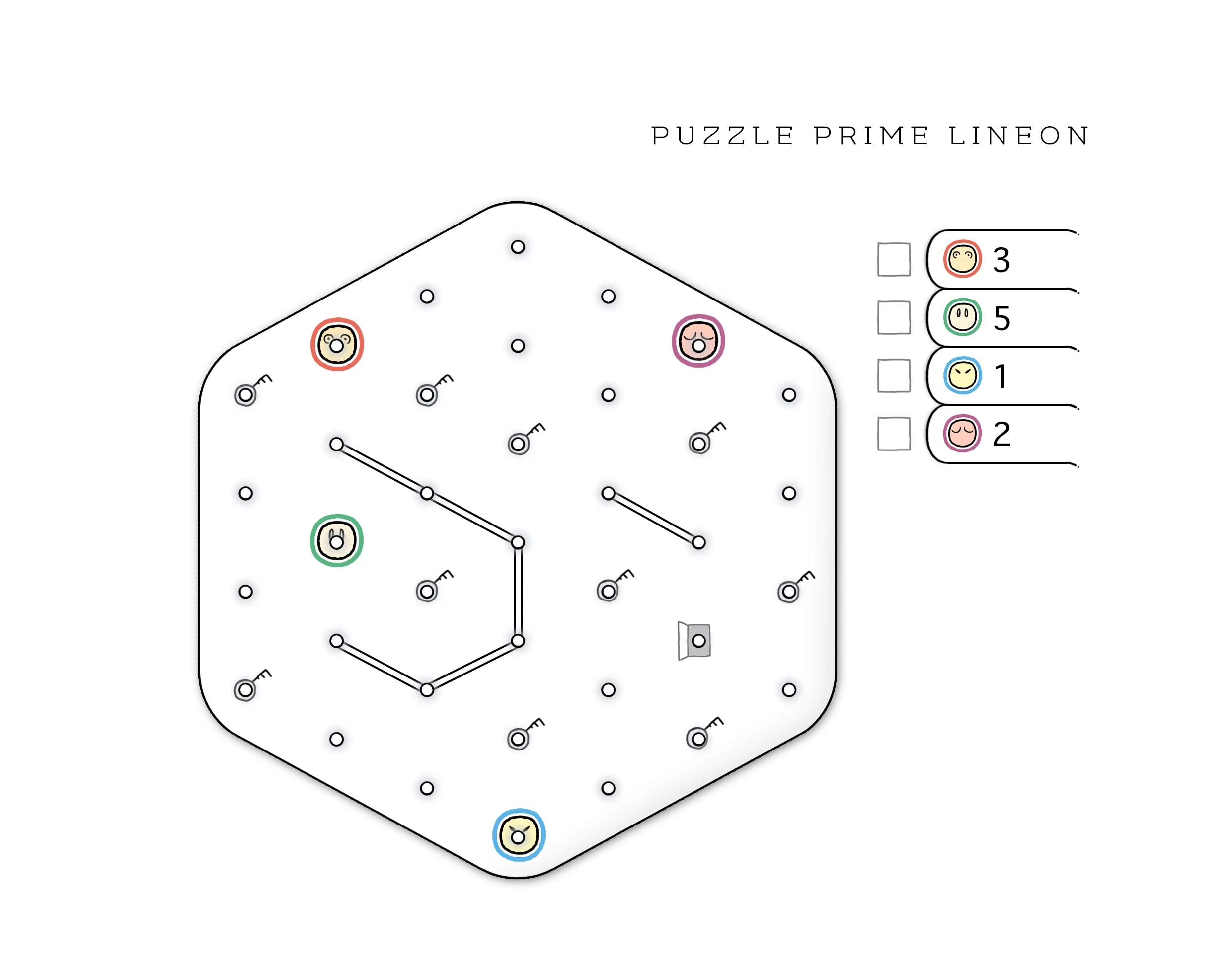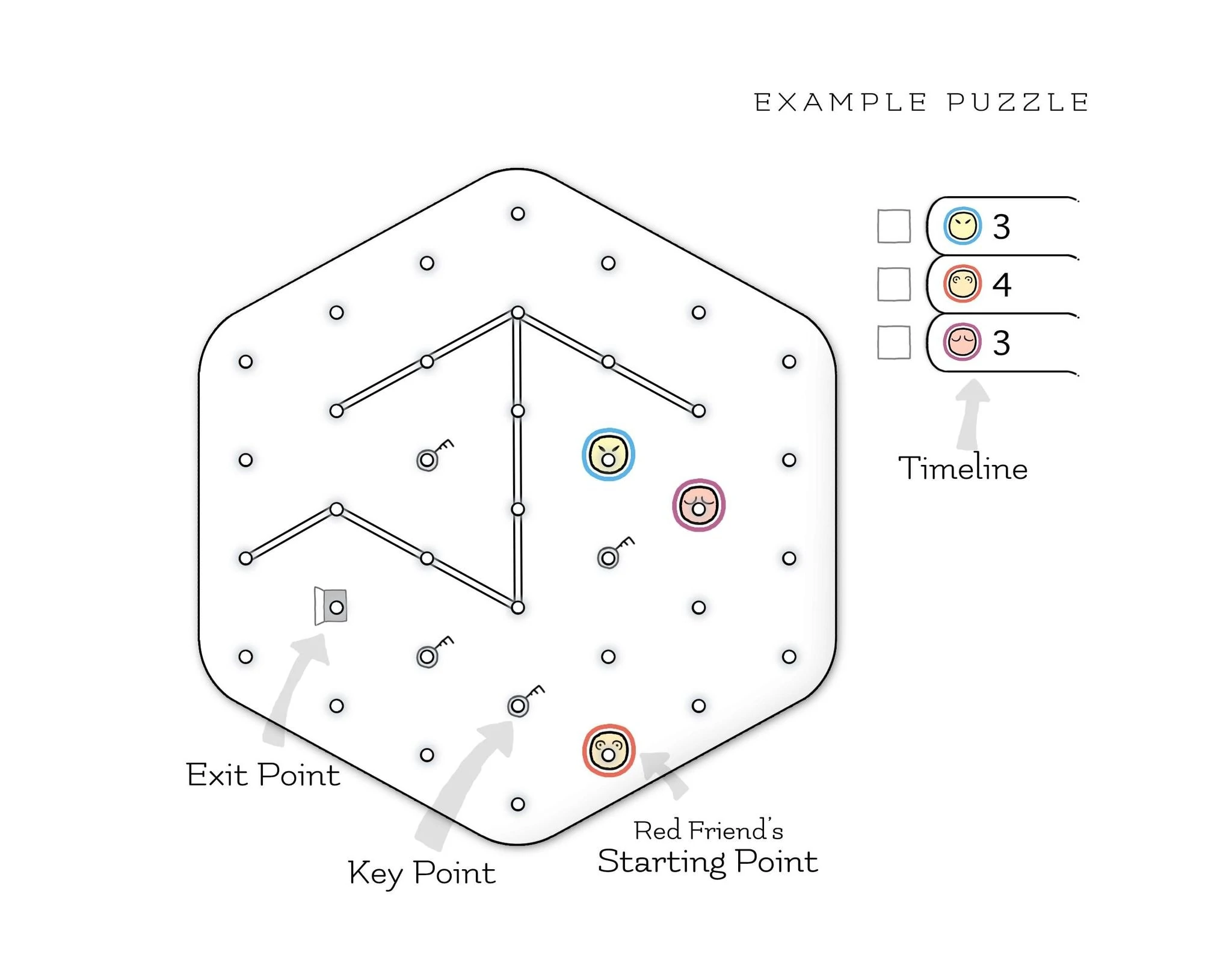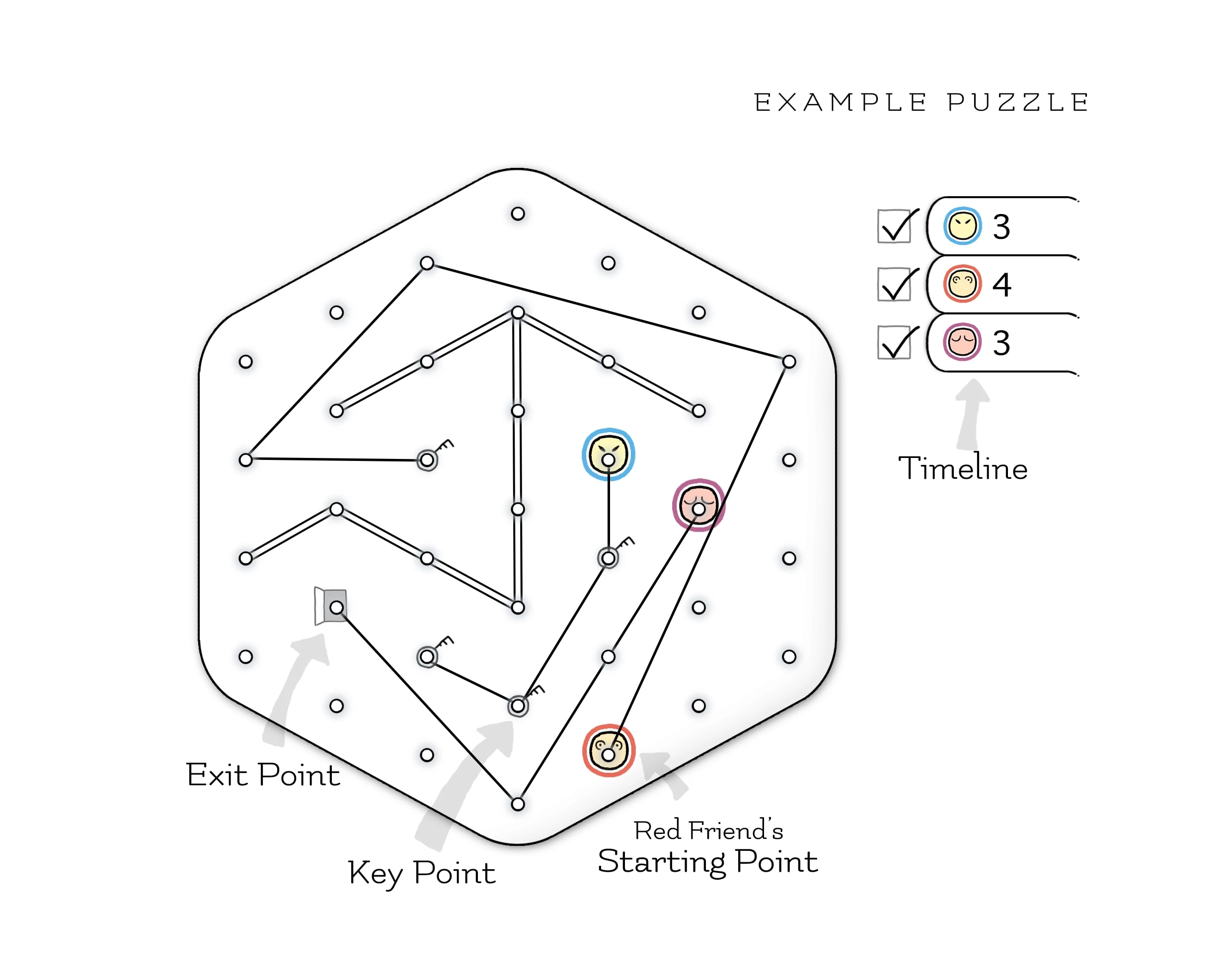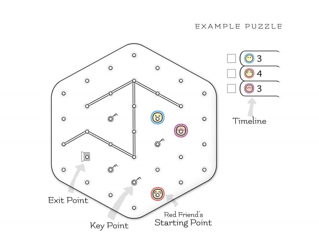 KEY POINTS, EXIT POINT, AND WALLS: One of the Friends must move to the Exit Point, but before he does that, each of the Key Points must be already connected with a line. A Wall is a double line and no Friend can cross or touch it.