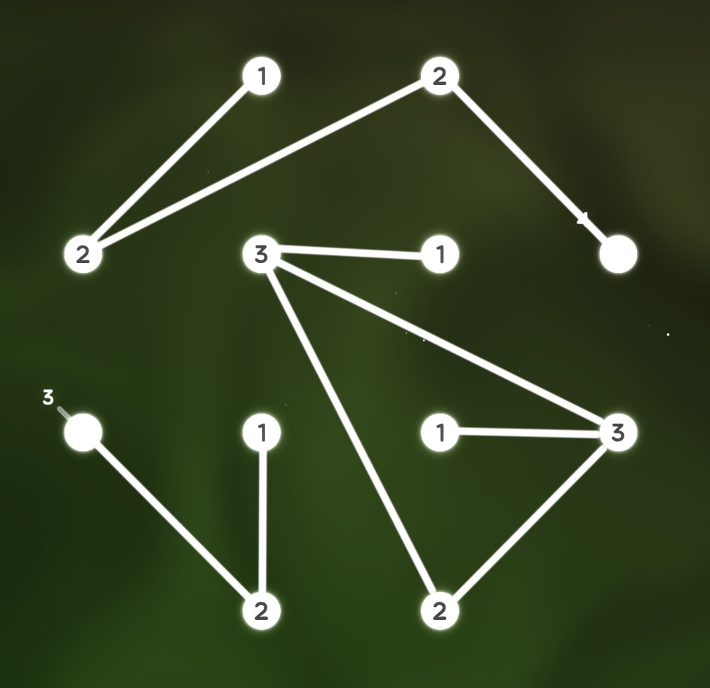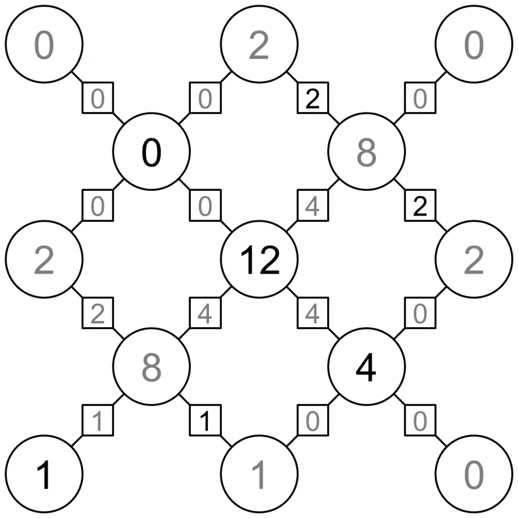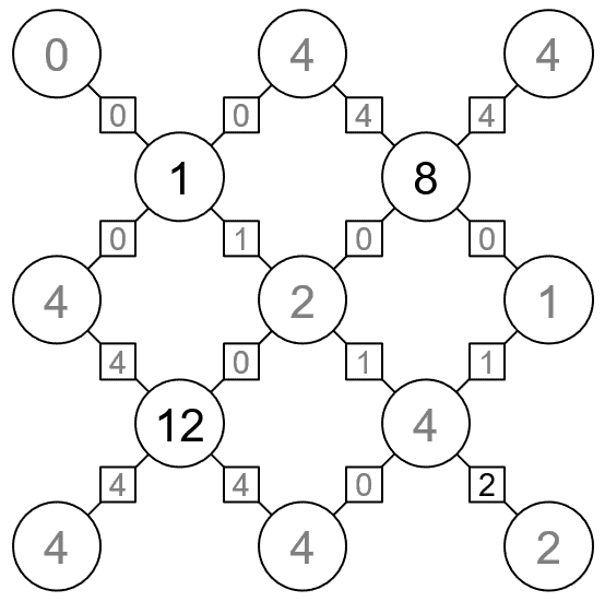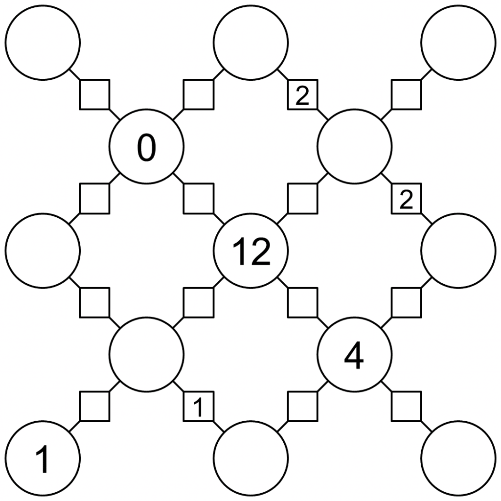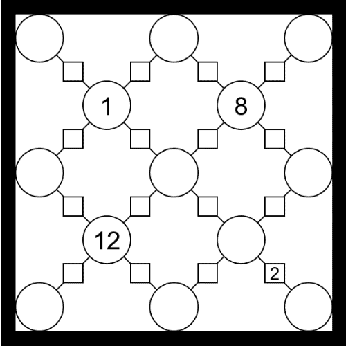 Circles are particles and lines joining them are bonds. The objective is to find all the hidden values, following these four rules: