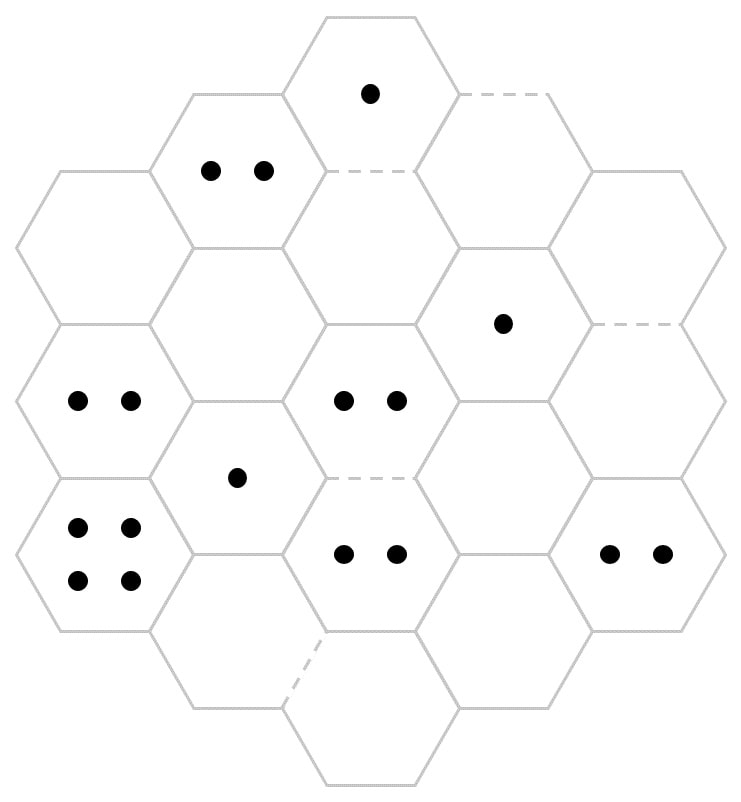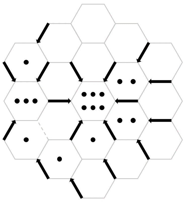 Place arrows along hexagon edges so that the number of arrows pointing to each hexagon equals the number of dots inside, adhering to the following rules: