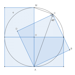 Let the three squares touch at point O. Let ABCD be the fourth square, and A be the common vertex of the three squares. Let c be the circle with center O and radius OA. We have ∠BCA = 45°, and then C \in c. Therefore, ∠ACM = 90°, where AM is the diameter of c. Since ∠ACD = 45°, we get ∠DCM = 45°.