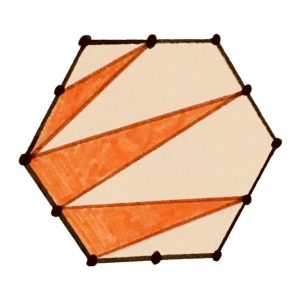 What fraction is shaded? The hexagon is regular, with equally spaced dots around its perimeter.