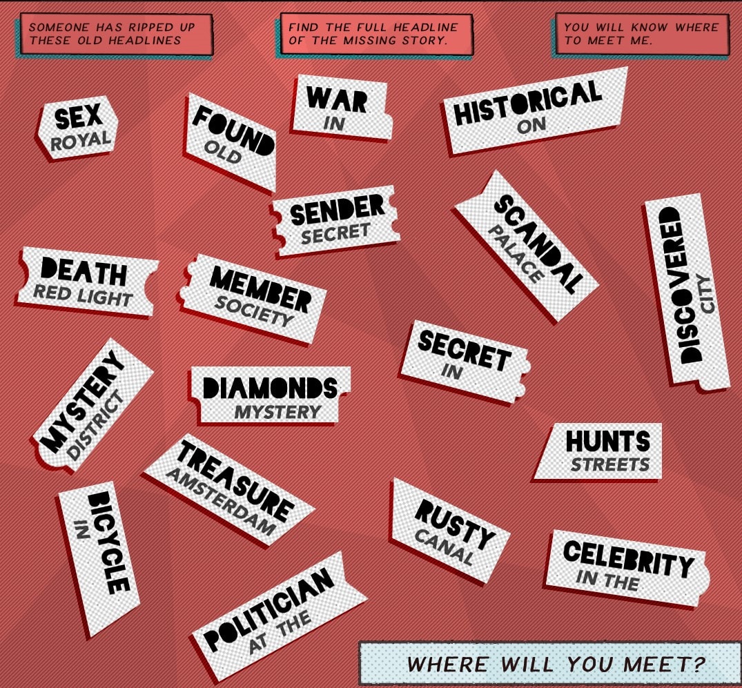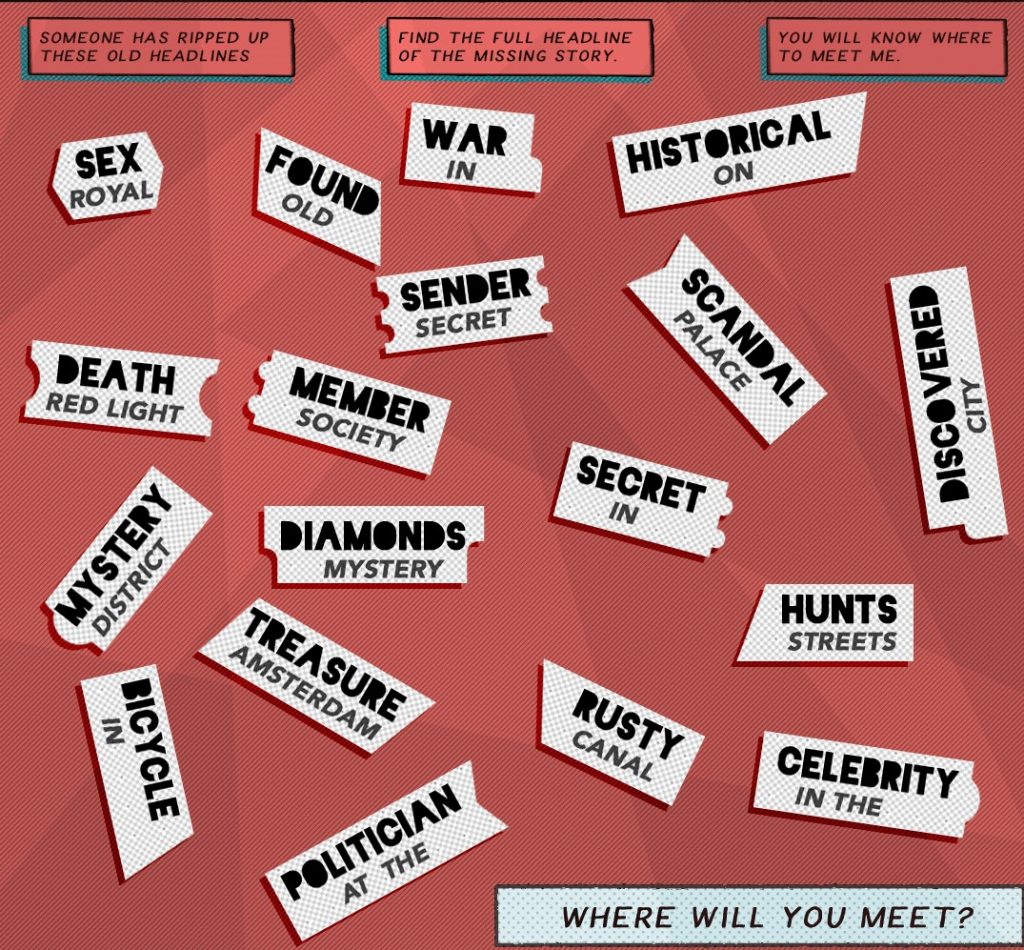 I noticed some small papers on the ground containing seemingly random words. I looked carefully at them and realized that a few of the papers were forming the headline of the story I was looking for.