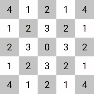 The digits represent the minimum number of knight-moves needed to reach the respective cells, starting from the center.