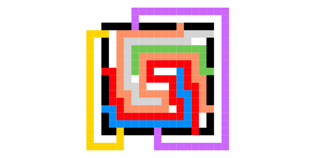Connect the pairs of squares with non-interacting lines that do not cross the black boundary.