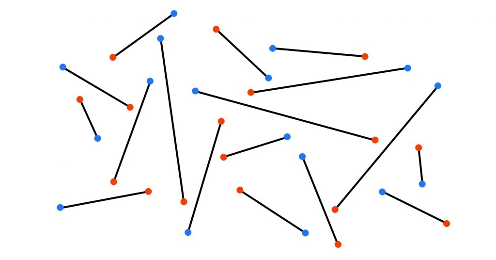 Connect the points in pairs of different colors so that the total length of all segments is minimal. If any two segments intersect, you can swap the two pairs among these four points and get a smaller total length.