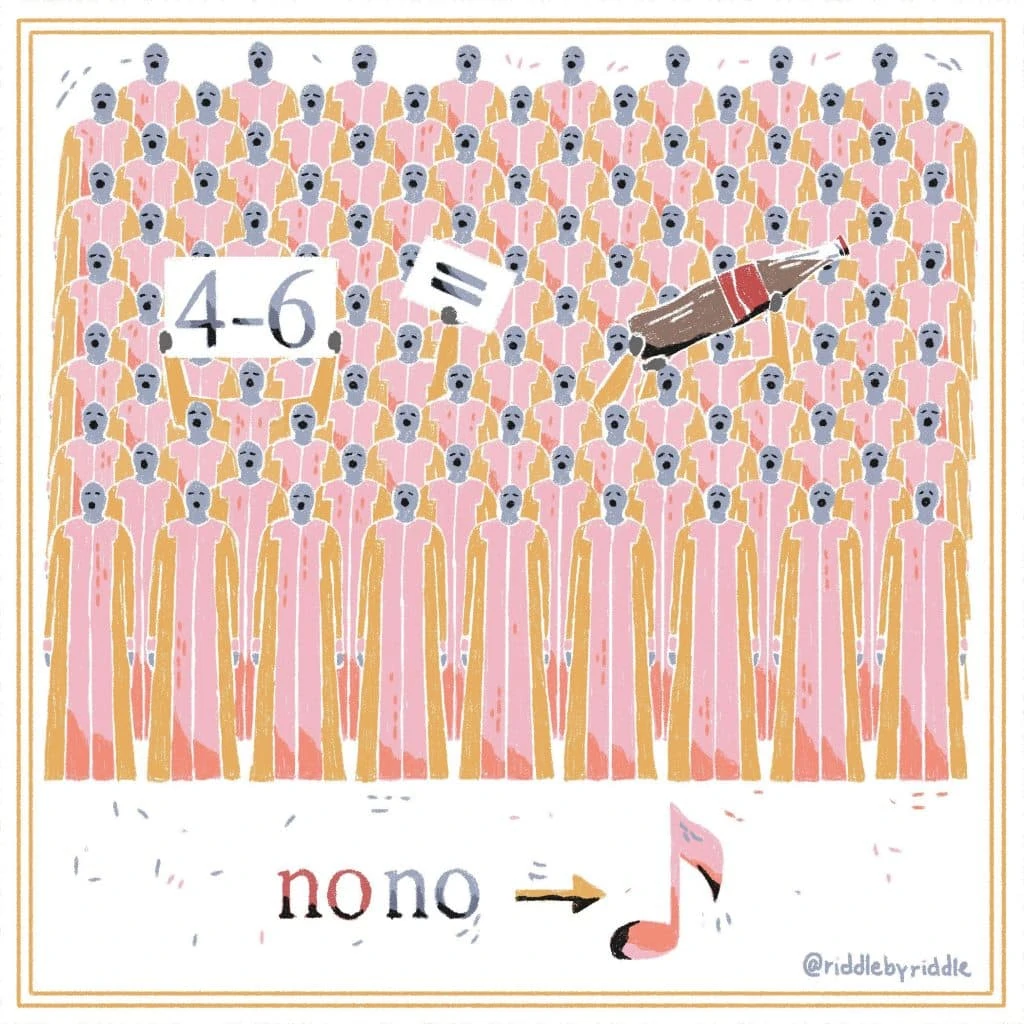 The singers on the picture represent a CHORUS. If you replace letters 4-6 with COLA, you get CHOCOLA. Finally, add NOTE with no NO and get CHOCOLATE.