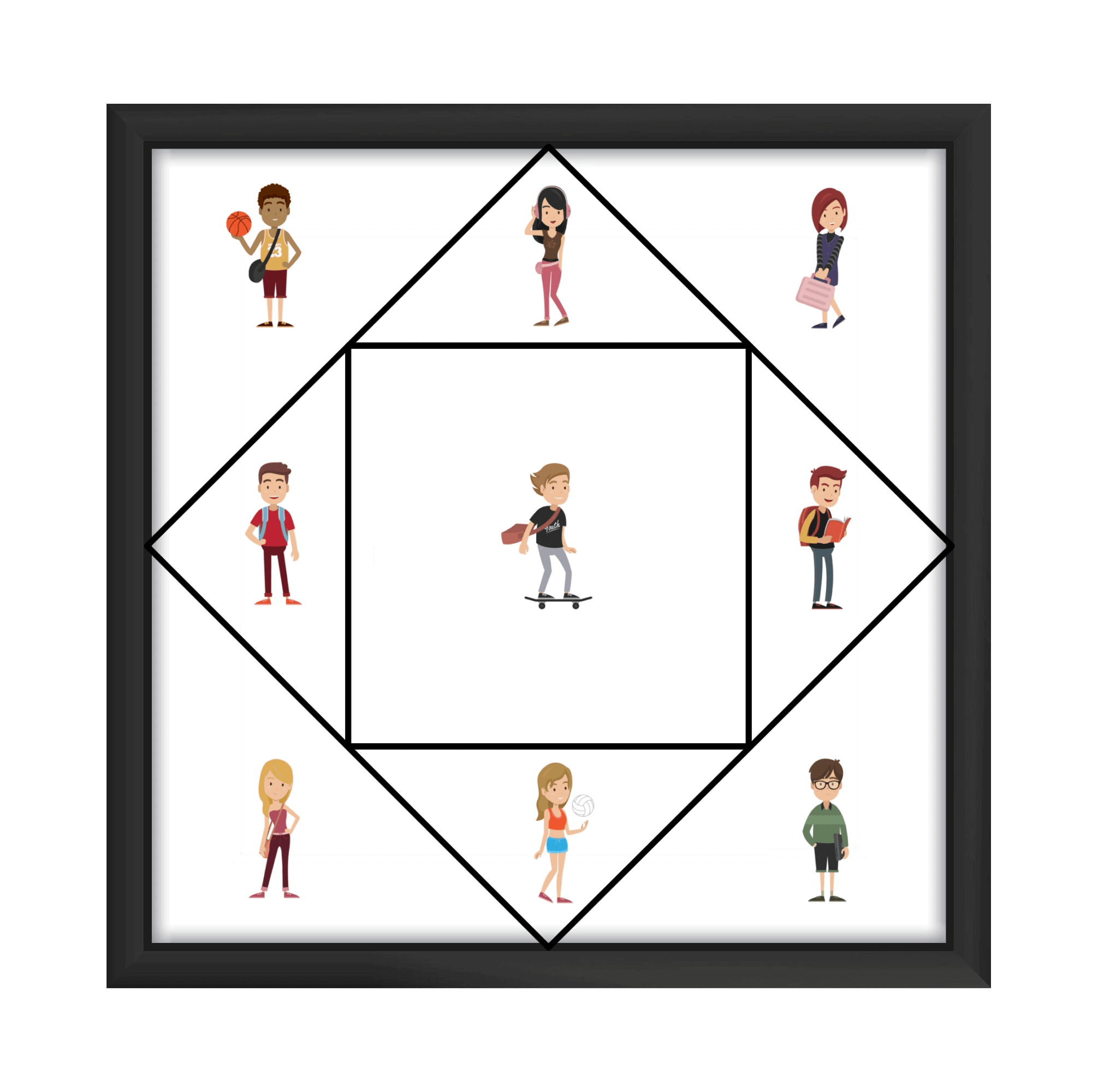 Color the rhombuses based on their type and imagine the diagram represents a structure of small cubes arranged in a larger cube. If you look at the large cube from three different angles, you will see exactly the three types of rhombuses on the diagram.