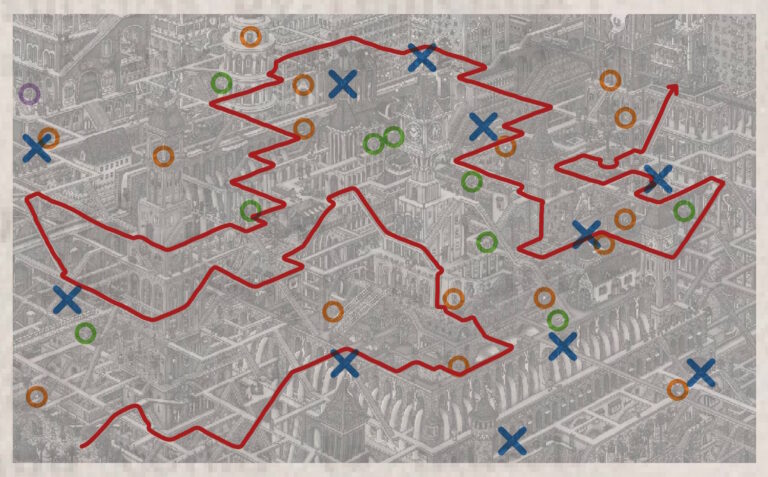 Detective Roy Omoshi (upper right) is chasing a dangerous criminal (lower left) through a destroyed maze. King Kong is trying to help Roy by putting together all the pieces of the maze so that the detective can safely traverse it. Analyze the picture and find the sequence of pieces Roy Omoshi will pass through before he catches the criminal. Some pieces (#1, #7, #8) consist of multiple horizontal segments, so it is possible that the detective visits them multiple times.